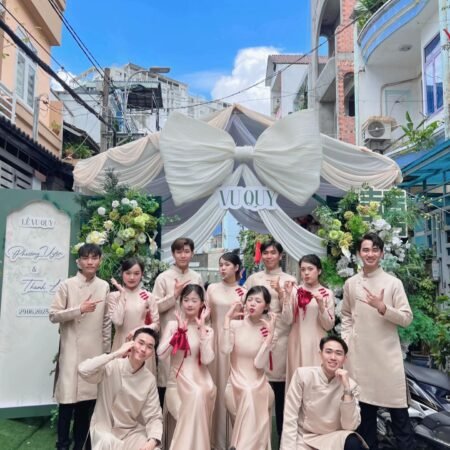 Trong các nghi thức cưới hỏi truyền thống, đội ngũ bưng quả đóng vai trò quan trọng, góp phần tạo nên vẻ đẹp trang trọng và lung linh cho ngày trọng đại. Để đội hình thêm phần đồng điệu và nổi bật, việc lựa chọn trang phục áo dài phù hợp là yếu tố then chốt. Áo Dài Hồng Tây Thi của chúng tôi là sự lựa chọn lý tưởng, mang đến vẻ đẹp cổ điển kết hợp nét hiện đại tinh tế. Với tông màu hồng dịu dàng, trang nhã, cùng phom dáng Tây Thi ôm gọn tôn dáng, bộ áo dài này không chỉ giúp đội bưng quả tỏa sáng mà còn thể hiện sự chu đáo và gu thẩm mỹ của gia chủ. Dịch vụ thuê áo dài của chúng tôi cam kết mang đến những bộ trang phục chất lượng cao, luôn được bảo quản cẩn thận và sẵn sàng phục vụ cho ngày vui của bạn, đảm bảo sự kiện diễn ra trọn vẹn và hoàn hảo nhất.