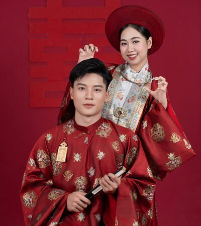 Set Viên Lĩnh Trơn Kèm Dây Quấn Đỏ Xanh là trang phục cổ phục Việt thường dùng trong ảnh cưới, thể hiện sự trang trọng và tinh tế. Cả nam và nữ đều phối chân váy trắng, tạo nền hài hòa cho áo viên lĩnh màu xanh (nam) và đỏ (nữ). Dây quấn cùng màu áo giúp tôn dáng và tạo điểm nhấn truyền thống. Chất liệu vải cứng cáp đứng form phù hợp cho các buổi chụp hình nghệ thuật hoặc lễ nghi truyền thống