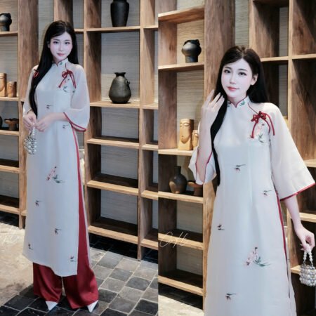 Áo được thiết kế theo phom truyền thống, ôm dáng nhẹ nhàng, tạo cảm giác thướt tha và kín đáo. Điểm nhấn là họa tiết hoa mai chi thêu tinh tế, mang ý nghĩa thanh cao, nhẹ nhàng, giúp tổng thể chiếc áo trở nên sang trọng nhưng không cầu kỳ. Chất liệu vải mềm mại, rũ nhẹ, phù hợp cả chụp ảnh ngoài trời lẫn trong studio.