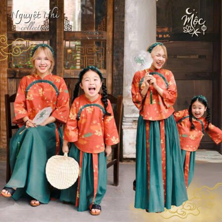 Set Áo Nguyệt Nhi Viền Ngực MỘC Cam nổi bật với thiết kế áo tay dài họa tiết hoa đỏ cam, mang đậm hơi thở truyền thống. Phần viền ngực được nhấn nhá tinh tế, tạo nét mềm mại và thanh lịch cho tổng thể. Kết hợp cùng chân váy xếp ly xanh ngọc, bộ trang phục tạo nên sự hài hòa giữa màu sắc và kiểu dáng. Phù hợp cho những dịp lễ hội, chụp ảnh nghệ thuật hoặc sự kiện mang phong cách văn hóa Việt.