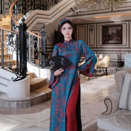 Thuê Áo Dài Nữ Xanh Hoạ Tiết Hoa Đỏ (Có Bigsize)