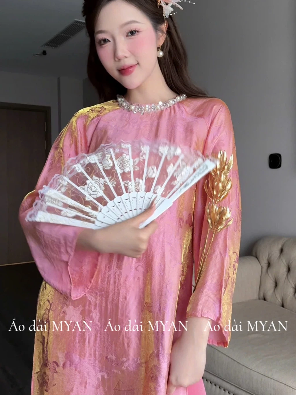Cho Thuê Áo Dài Hồng Cổ Tròn Đính Đá Vân Yên (Có Bigsize)