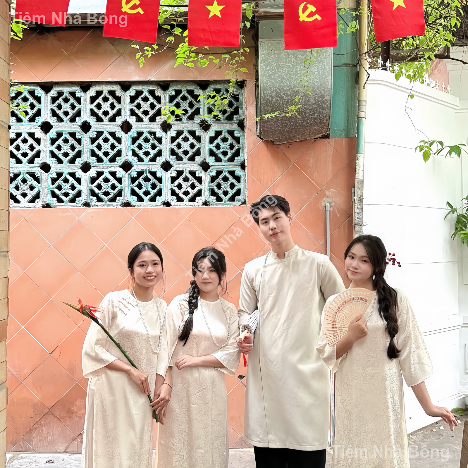 Cho Thuê Áo Dài Kem Gấm 3 Nút (Bưng Quả)