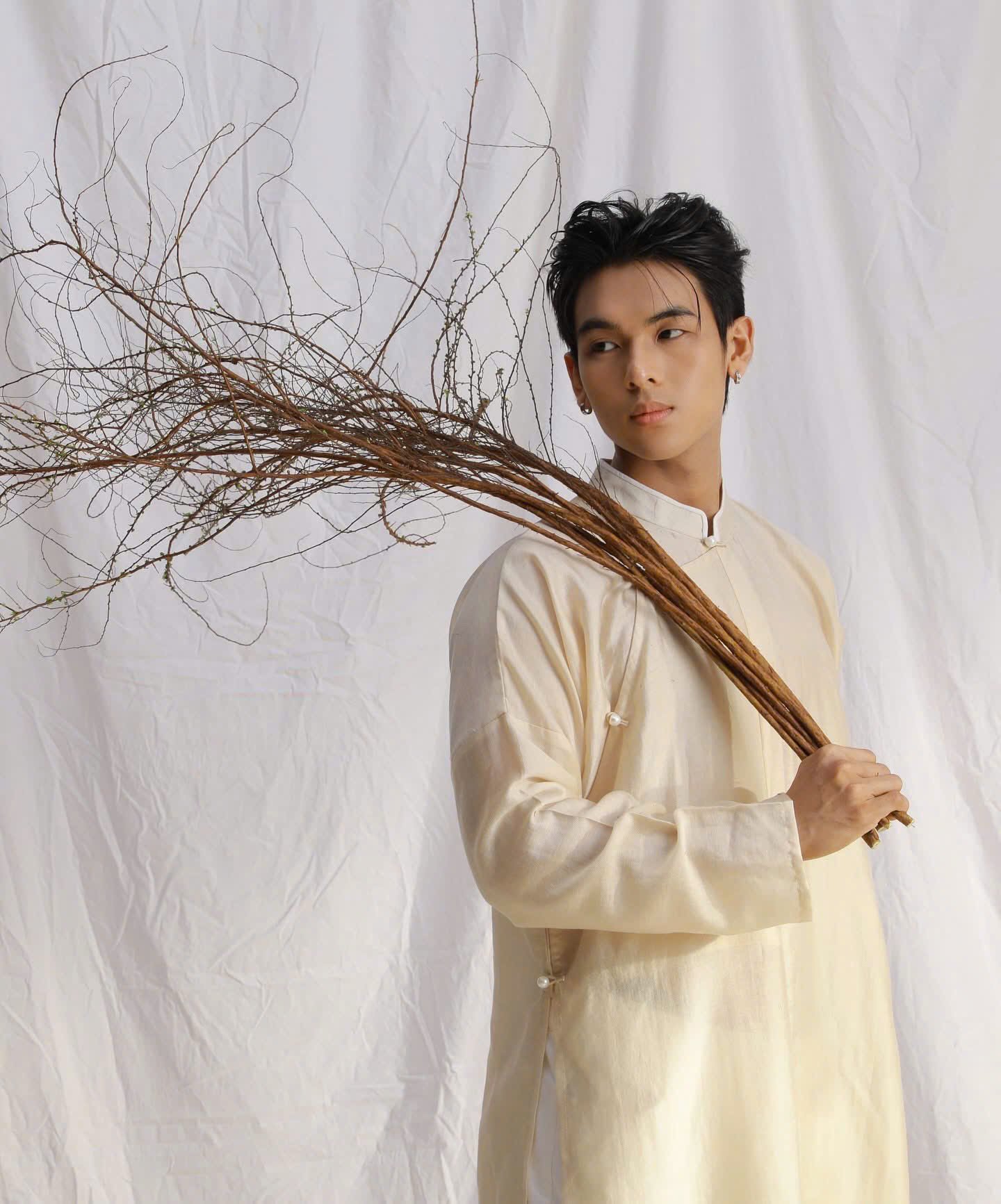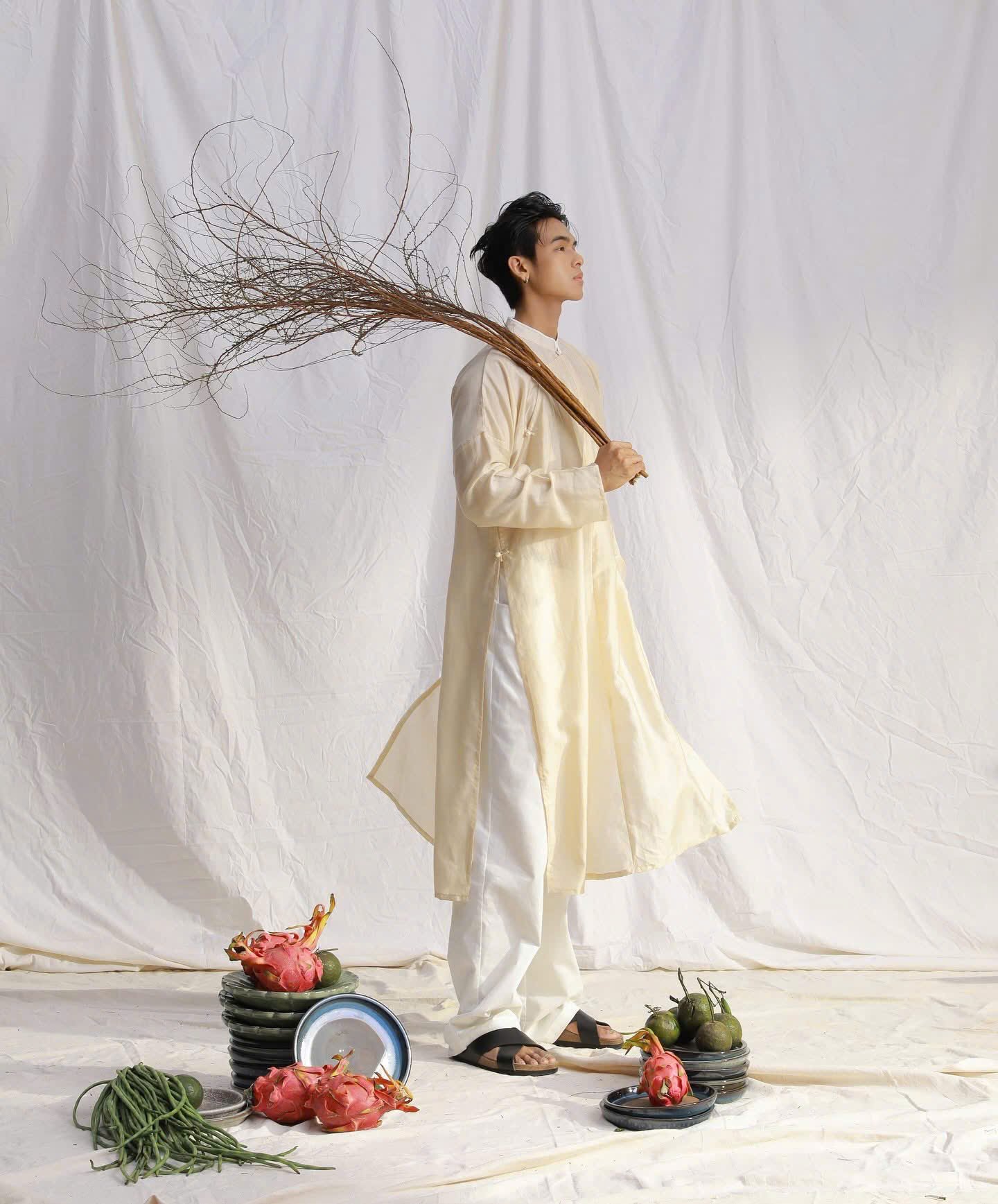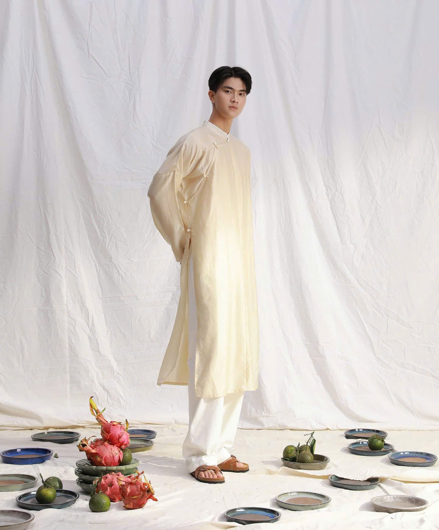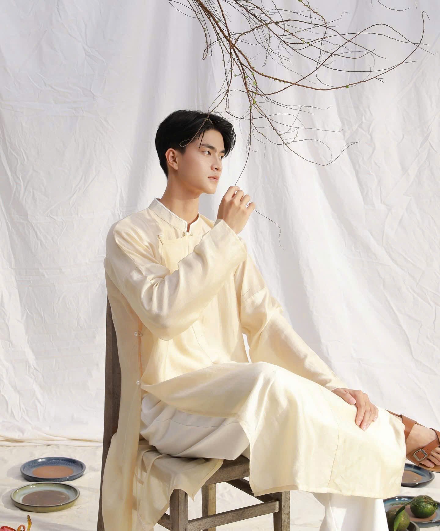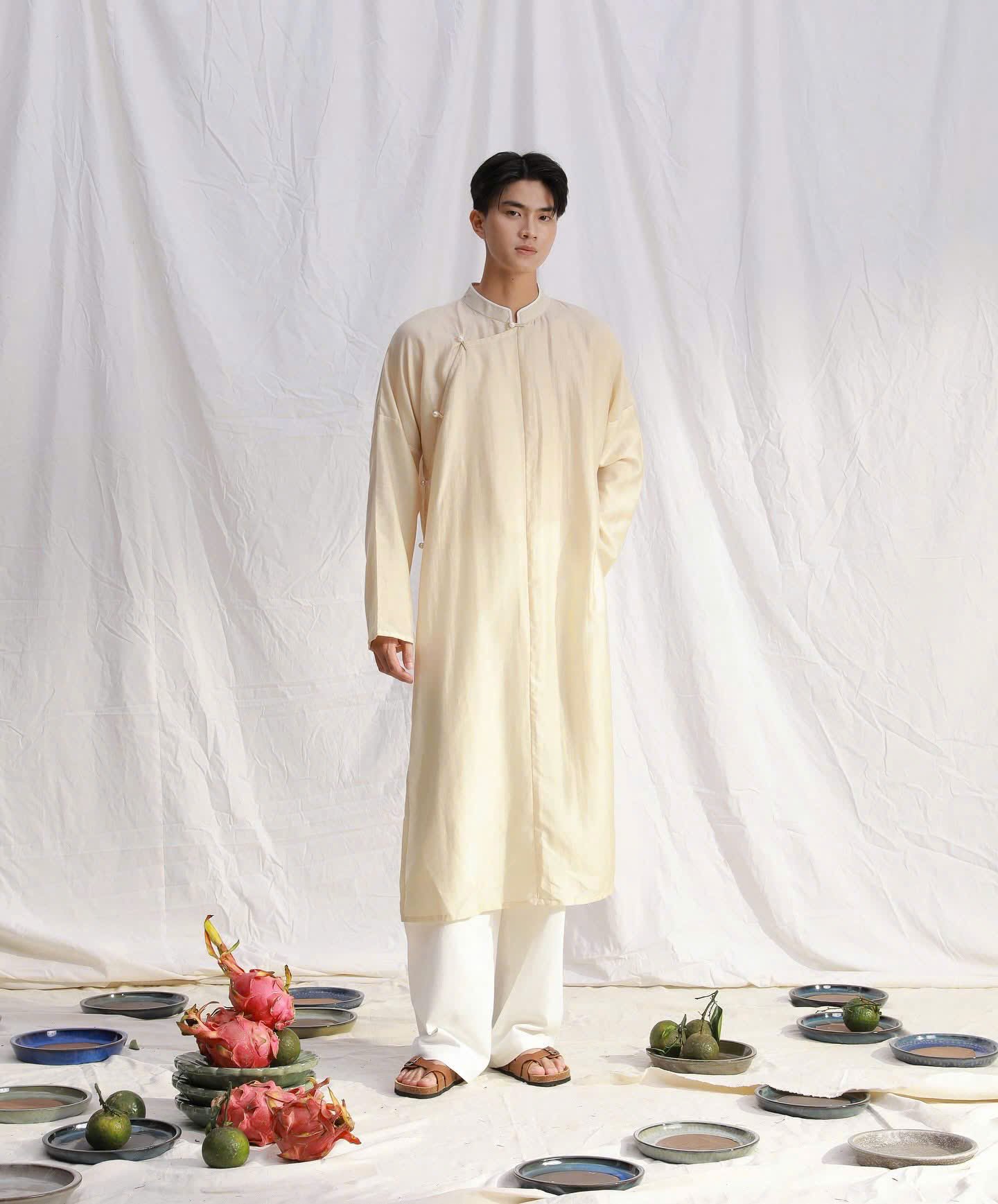 Cho Thuê Áo Dài Nam Ngũ Thân Linen Villa Wings Kem