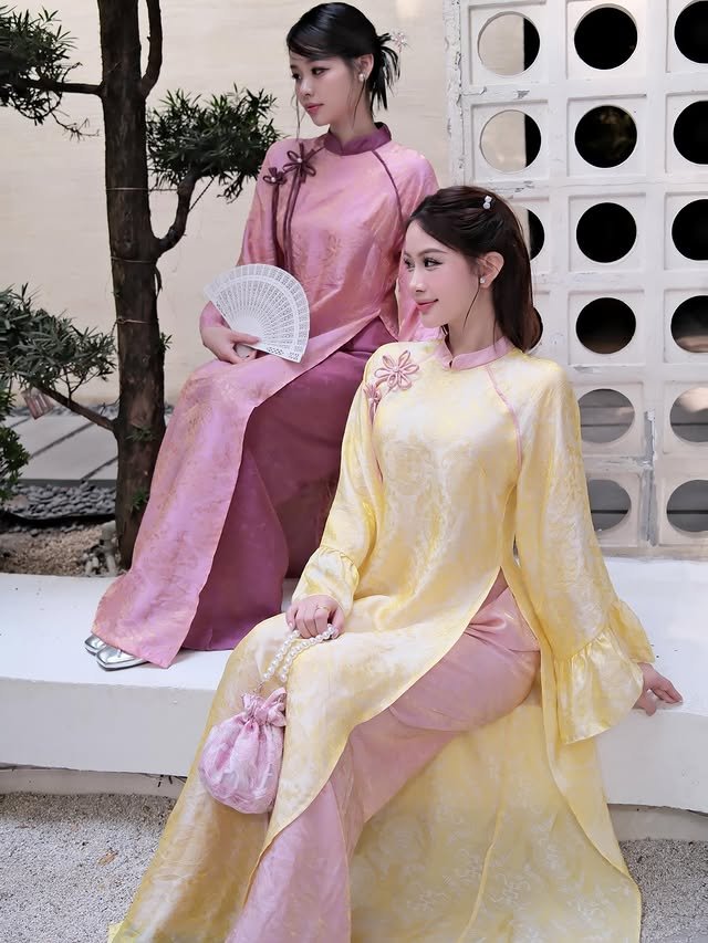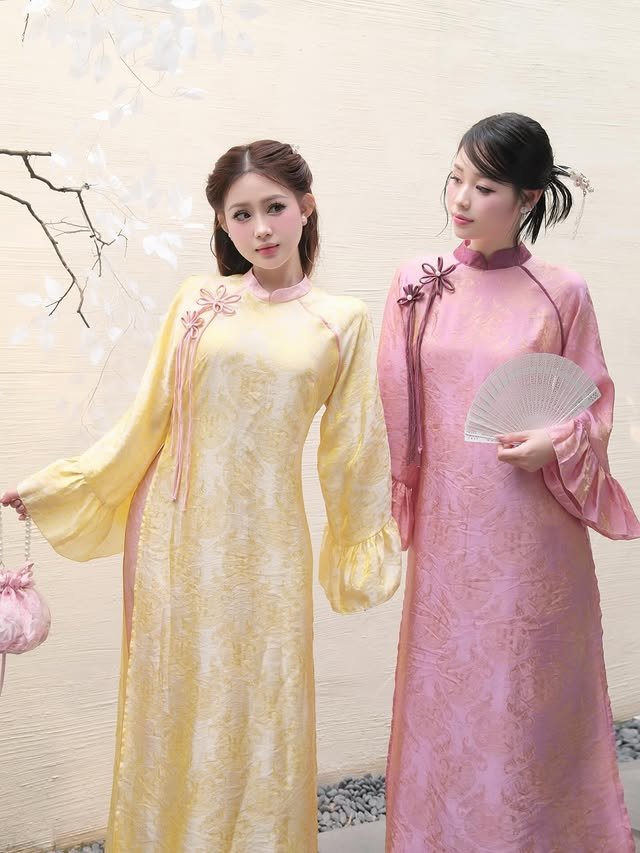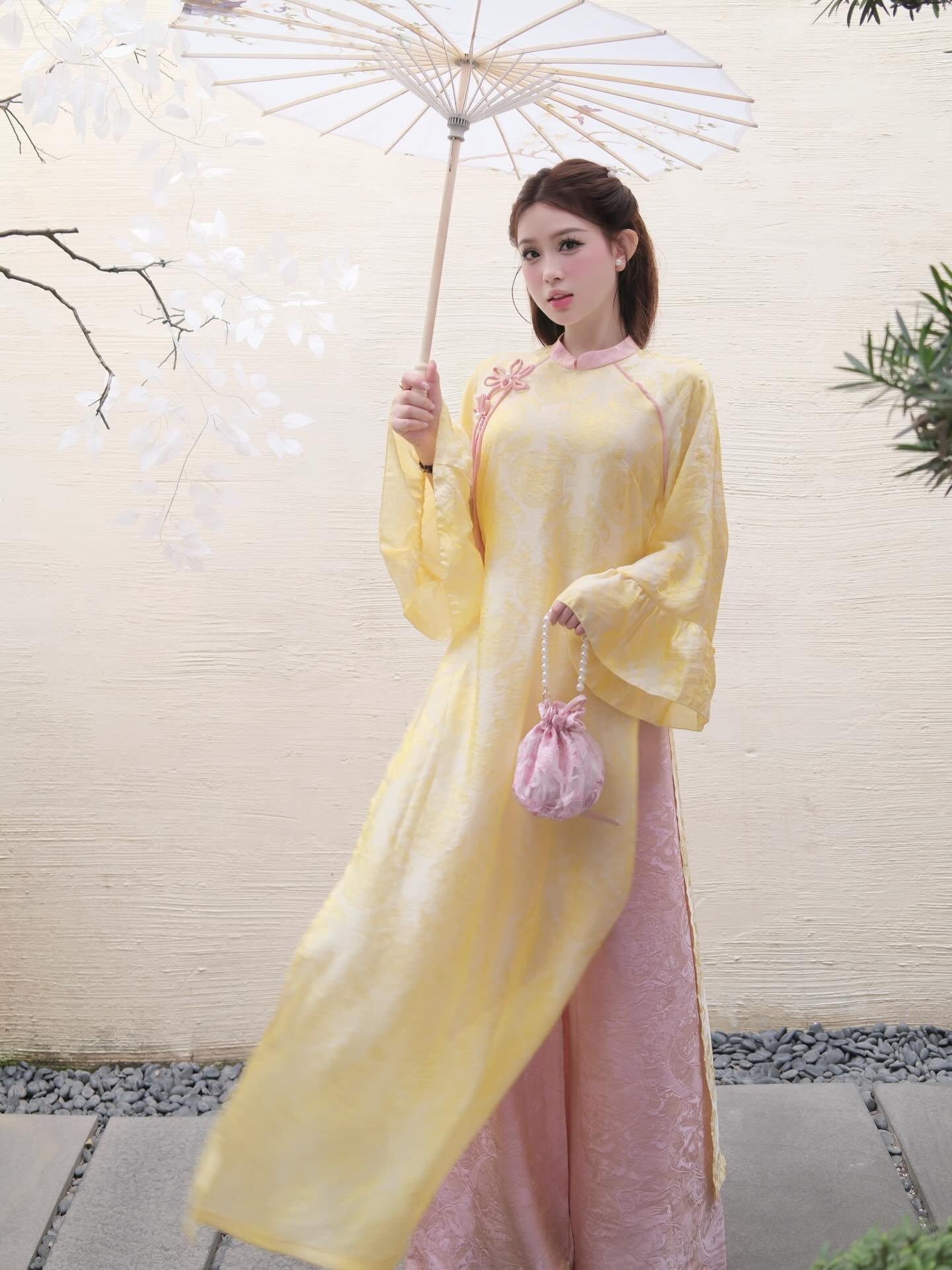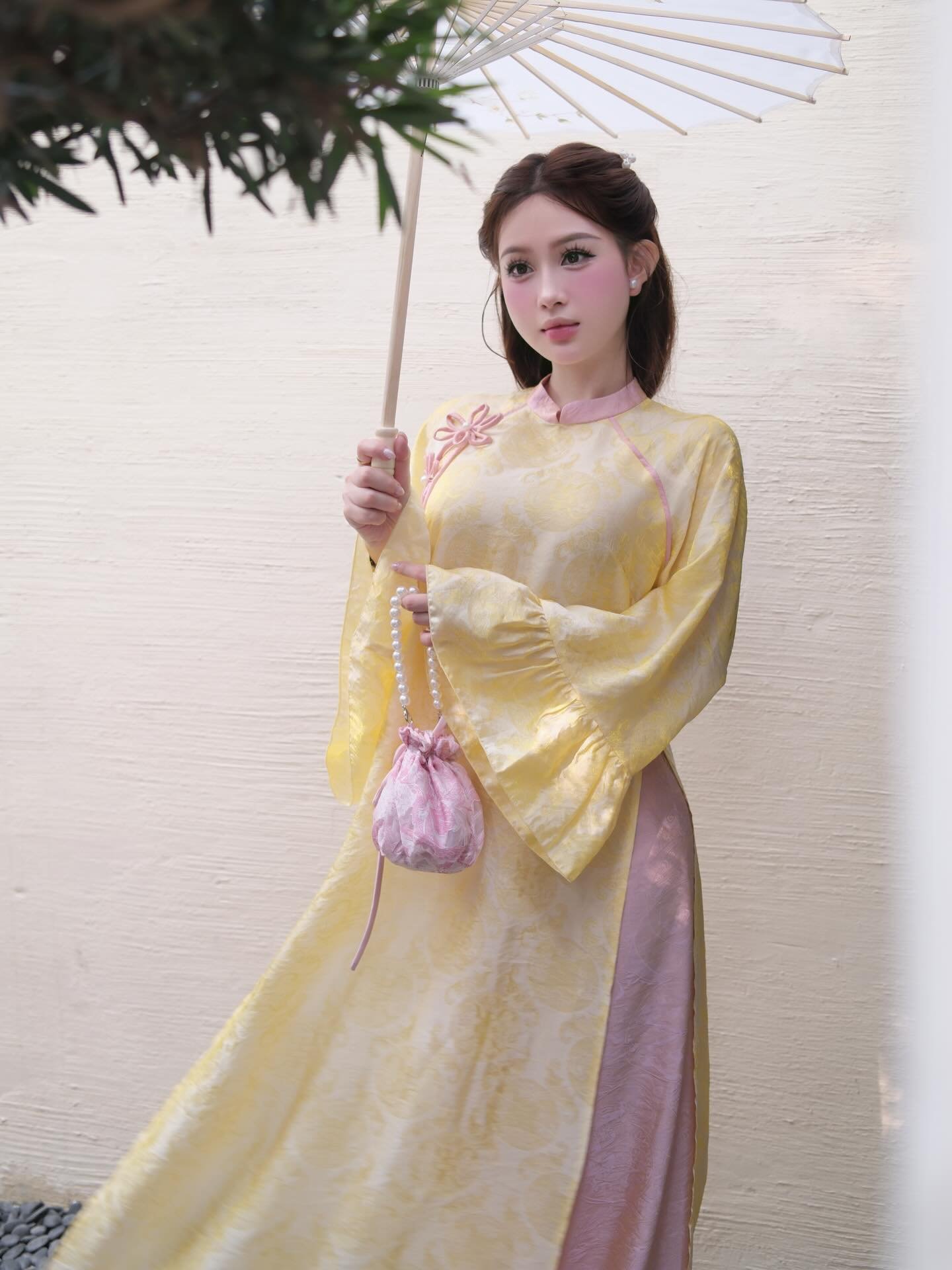 - Áo Dài Hoa Nổi Nhụy Vàng Hồng là một mẫu áo dài truyền thống đẹp và ấn tượng, được thiết kế với phần tà áo dài đến đầu gối, tay áo lửng và cổ trụ. Họa tiết hoa nổi nhụy vàng được đính trên nền vải màu hồng tạo nên sự tinh tế và nữ tính cho người mặc. Mẫu áo dài này phù hợp cho các cô nàng trẻ tuổi, có thể diện vào các dịp lễ tết, chụp ảnh kỷ yếu, tham dự tiệc cưới hay du xuân.