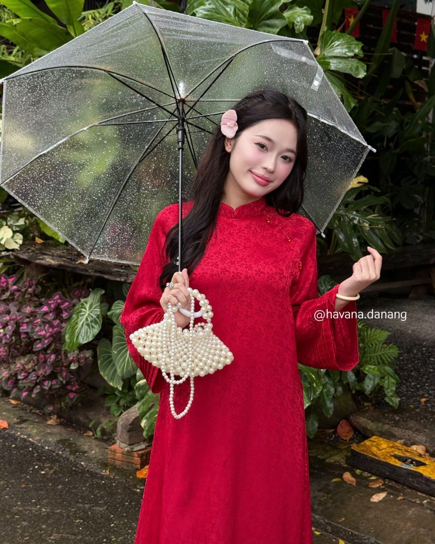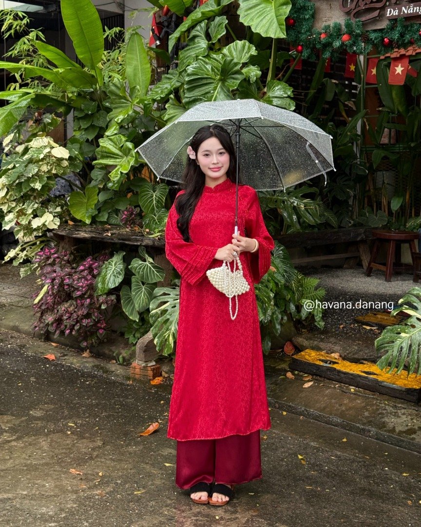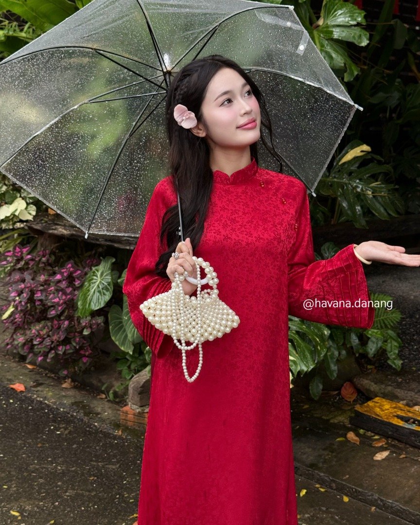 Cho Thuê Áo Dài Nữ Đỏ Gấm Cẩn Ngọc Havana
