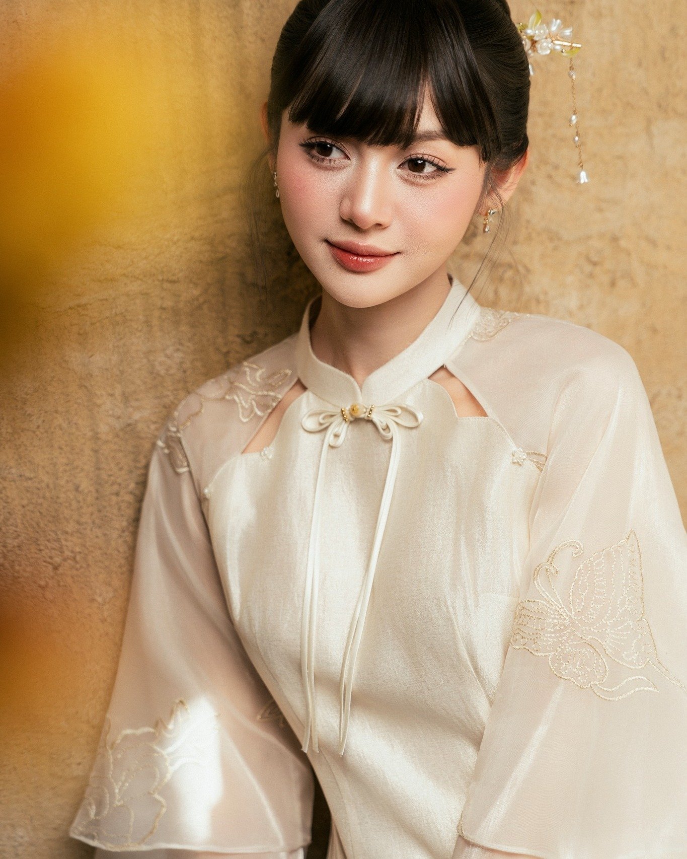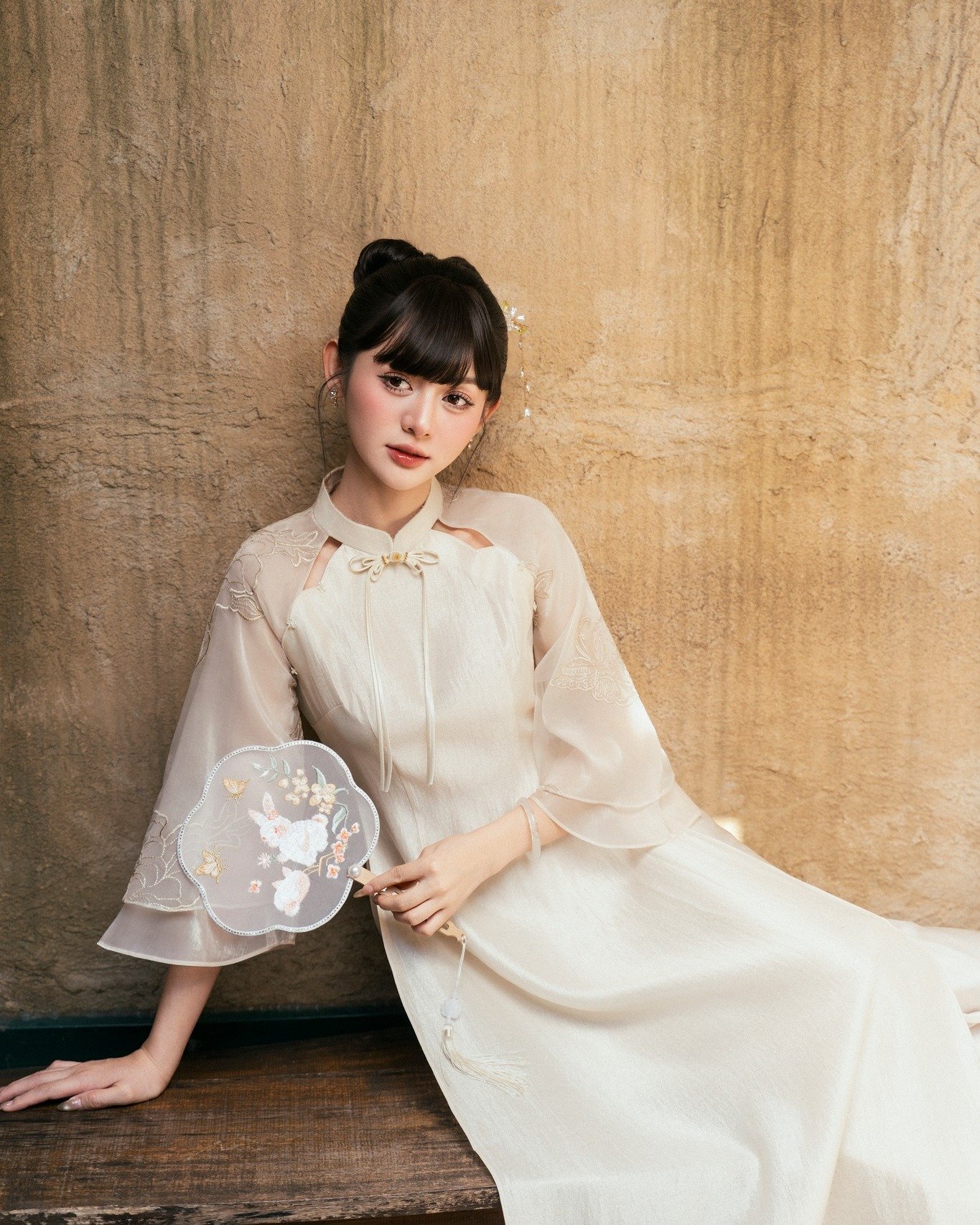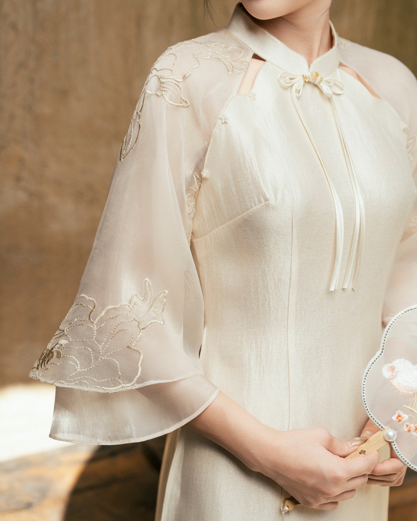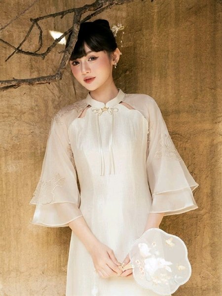 Cho Thuê Áo Dài Nữ Kem Cổ Trụ Đính Nơ Thêu Hoa Zamy