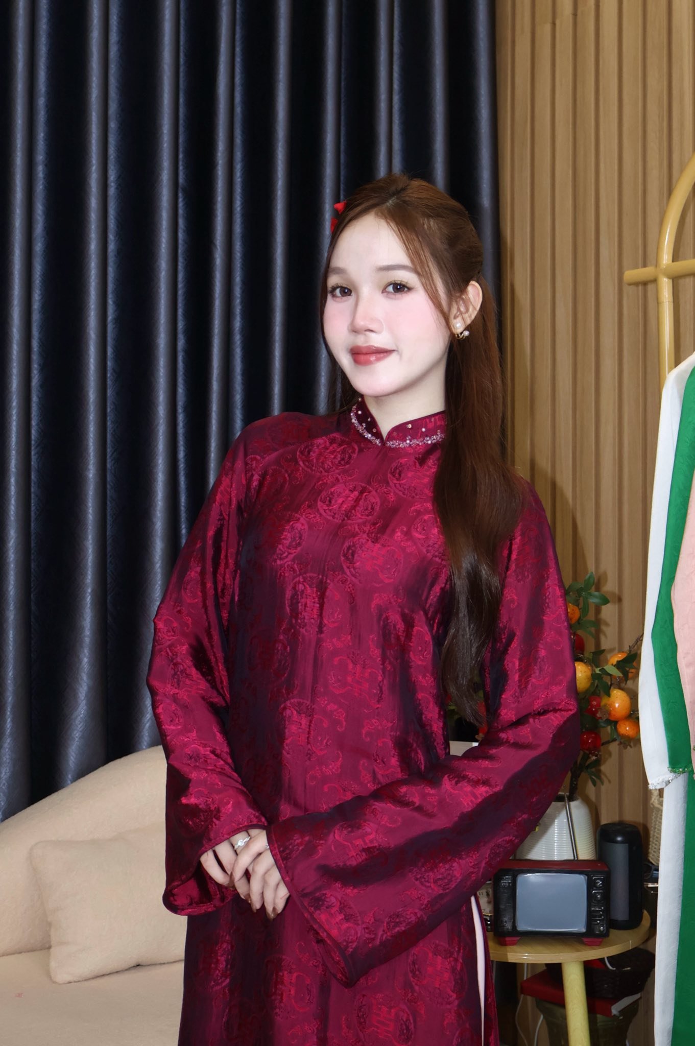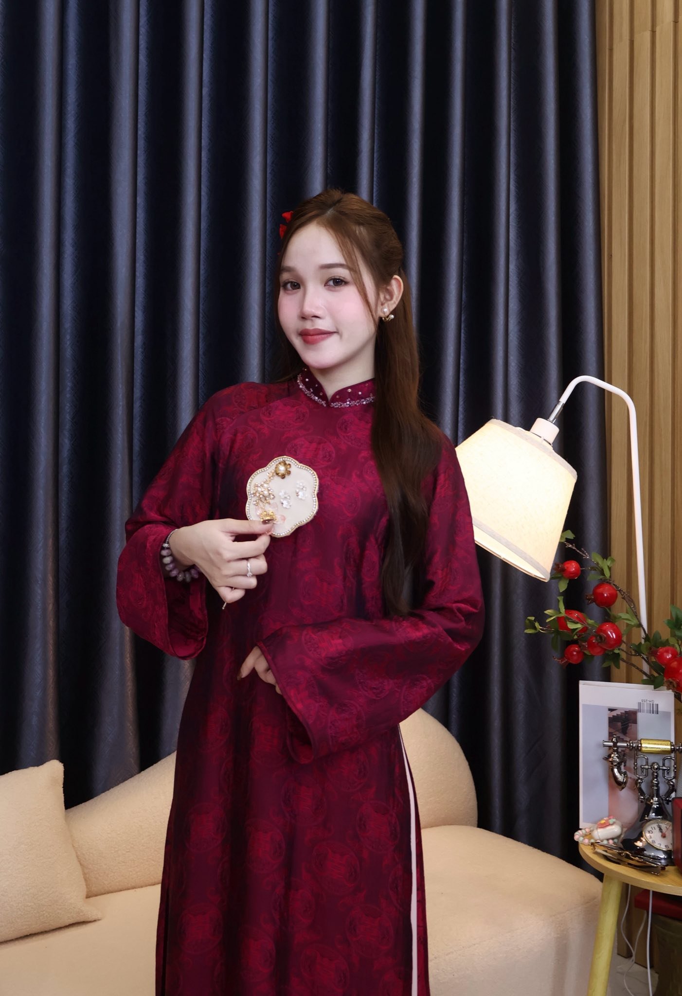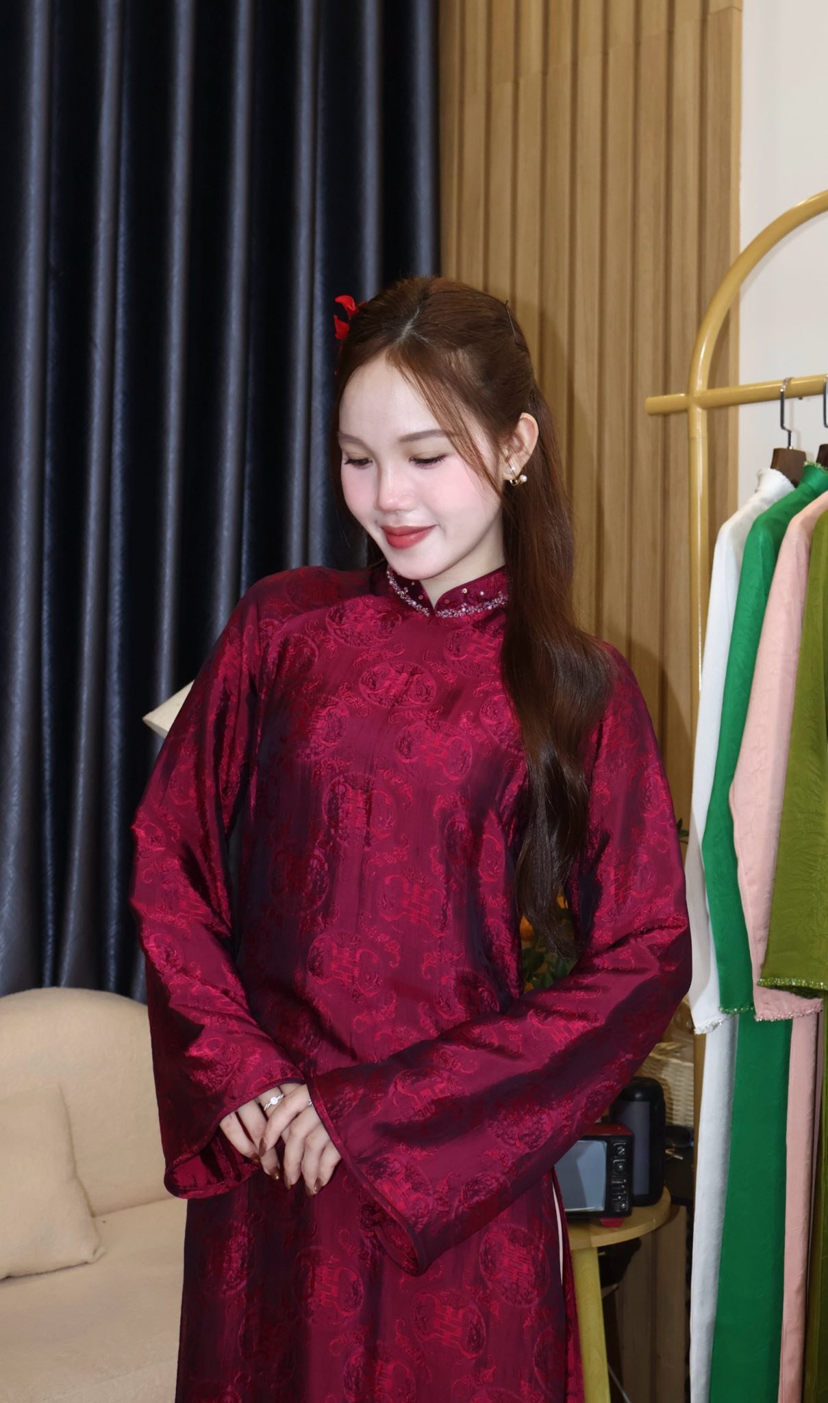 - Áo Dài Gấm Cổ Tròn Viền Ngọc Trai Đỏ là một kiểu áo dài được may bằng vải gấm đỏ thắm, có họa tiết gấm mang lại nét quý tộc truyền thống. Kiểu áo dài này có cổ tròn rộng, được đính kết những hạt ngọc trai trắng lấp lánh quanh viền cổ tạo điểm nhấn sang trọng và lộng lẫy. Áo Dài Gấm Cổ Tròn Viền Ngọc Trai Đỏ phù hợp cho các dịp lễ, tiệc, cưới hỏi hay chụp hình.