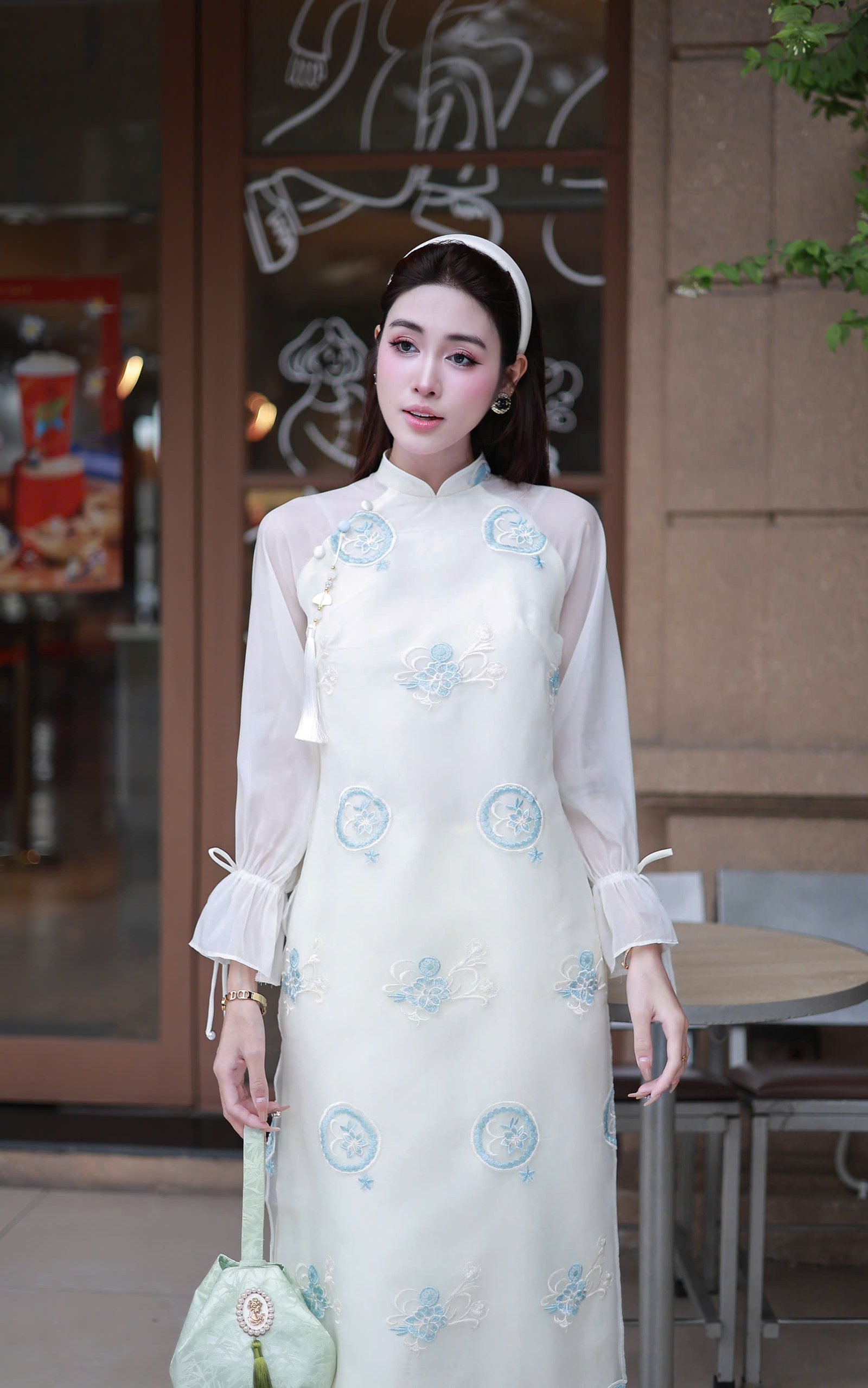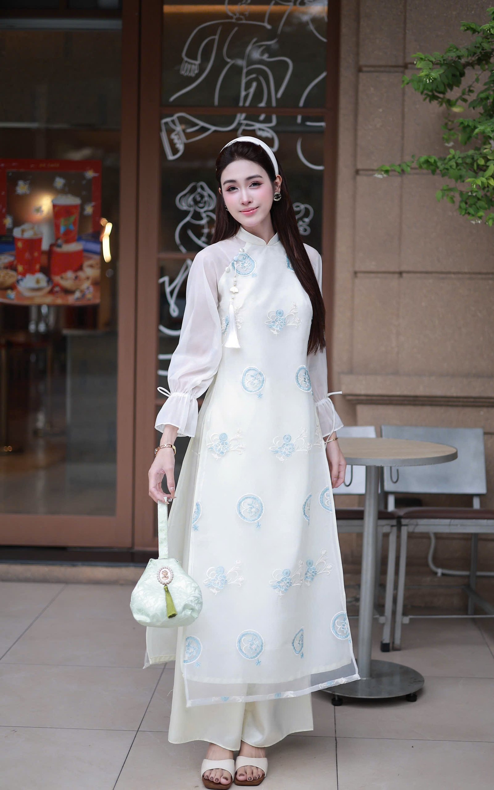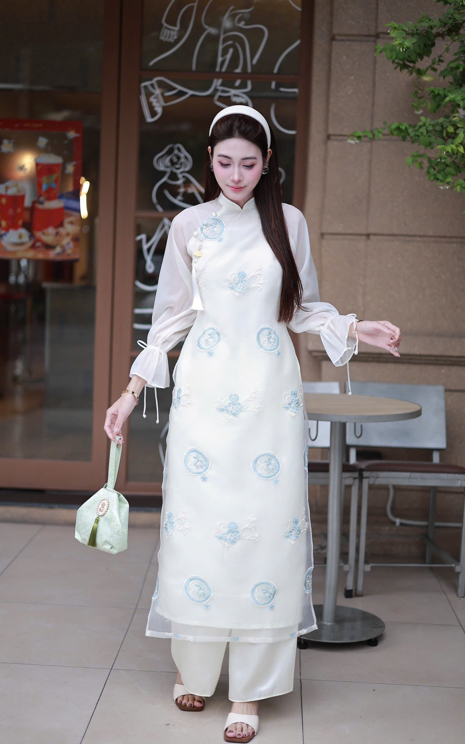 Cho Thuê Áo Dài Nữ Trắng Thêu Hoa Xanh Tay Bồng