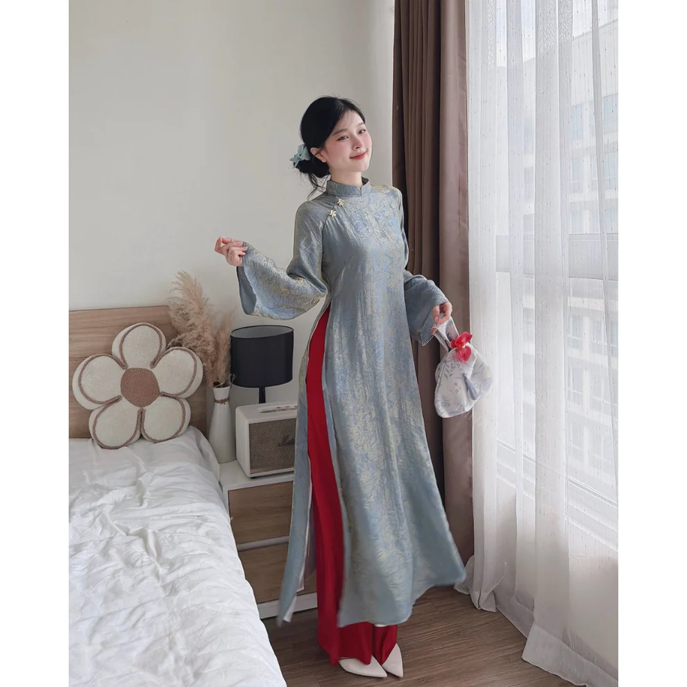 Điểm nhấn là chi tiết hoa đính ngọc trai tinh xảo, mang lại vẻ quý phái và nữ tính cho trang phục. Mẫu áo phù hợp khi thuê chụp ảnh áo dài, dự lễ gia tiên, cưới hỏi, Tết hoặc các sự kiện trang trọng. Dễ phối cùng quần lụa và phụ kiện truyền thống.