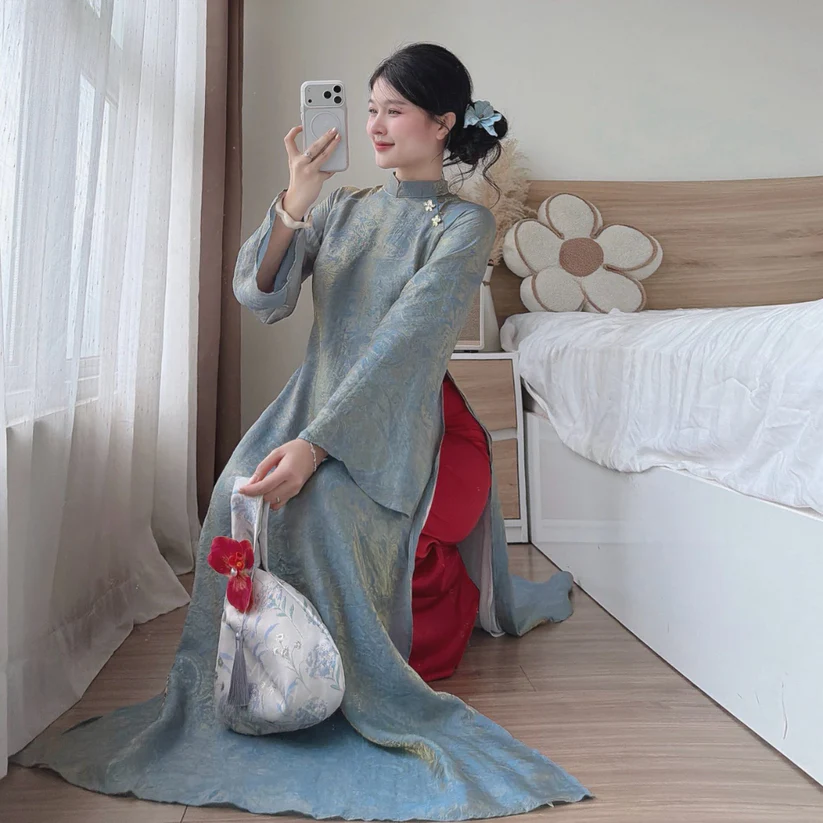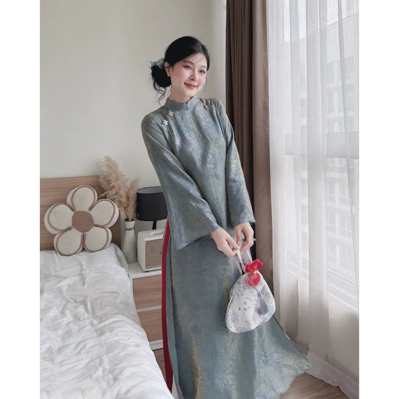 Cho Thuê Áo Dài Nữ Xanh Cẩm Nguyệt Đính Hoa Ngọc Trai (Có Bigsize)