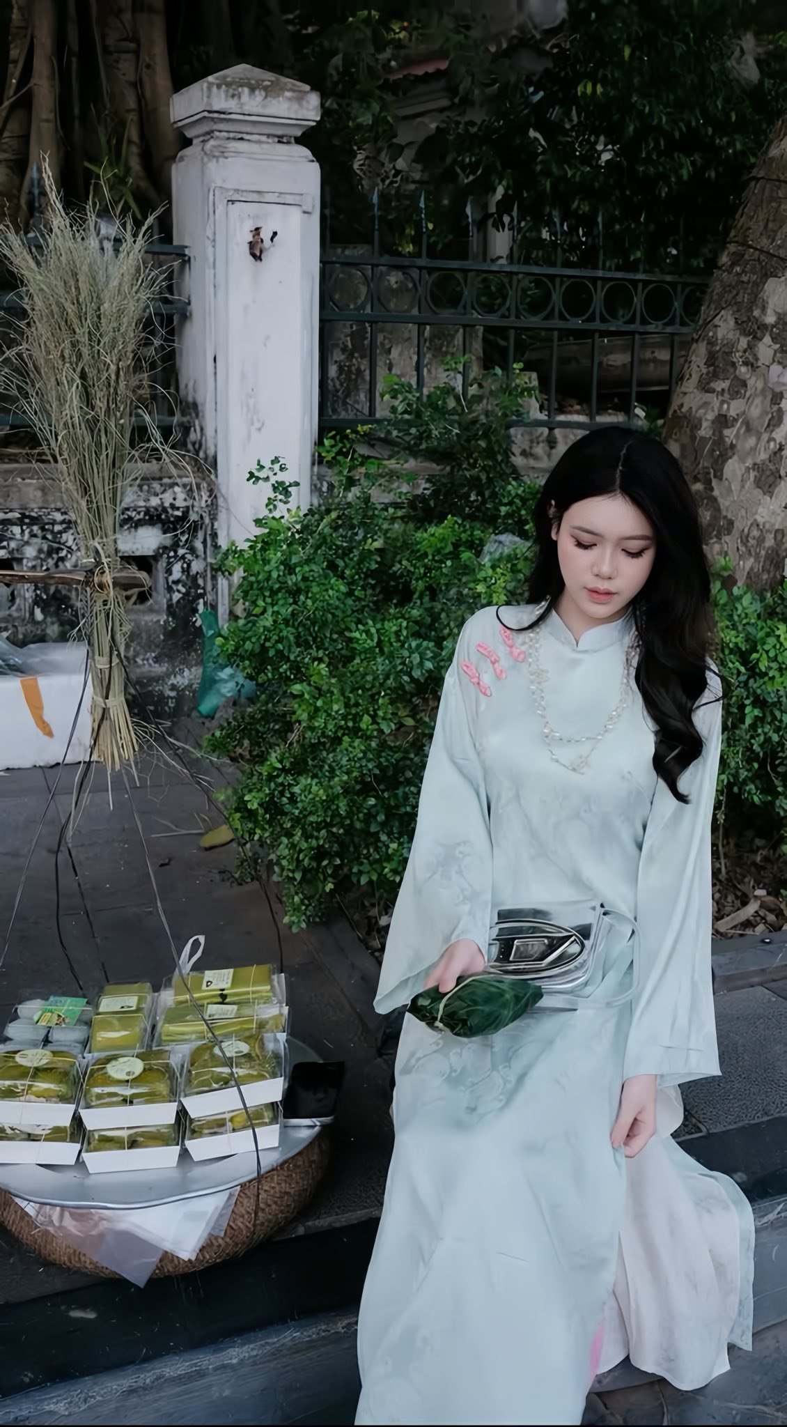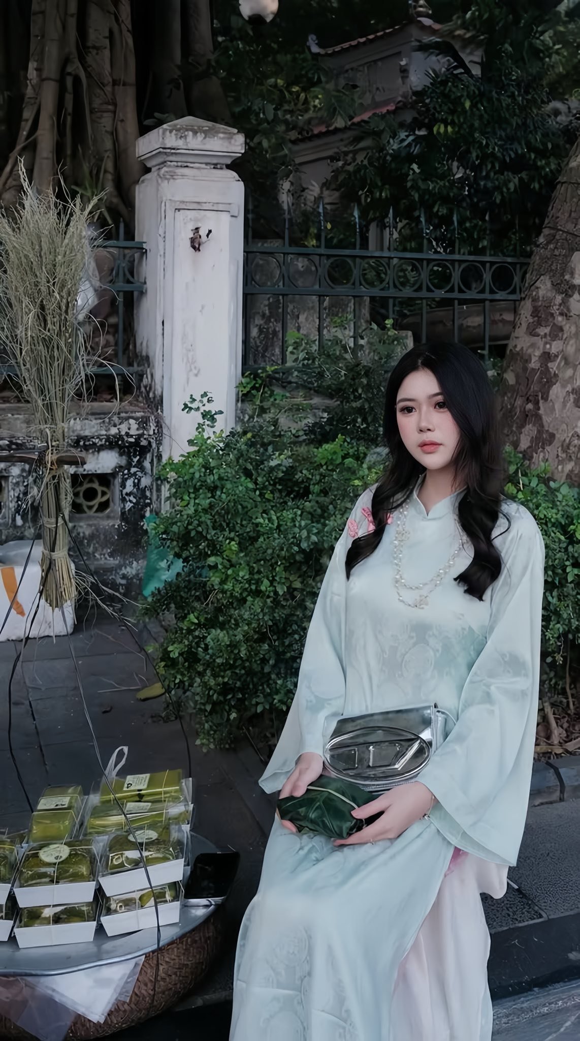 Cho Thuê Áo Dài Nữ Xanh Mint Đồng Tiền 3 Nút Tàu