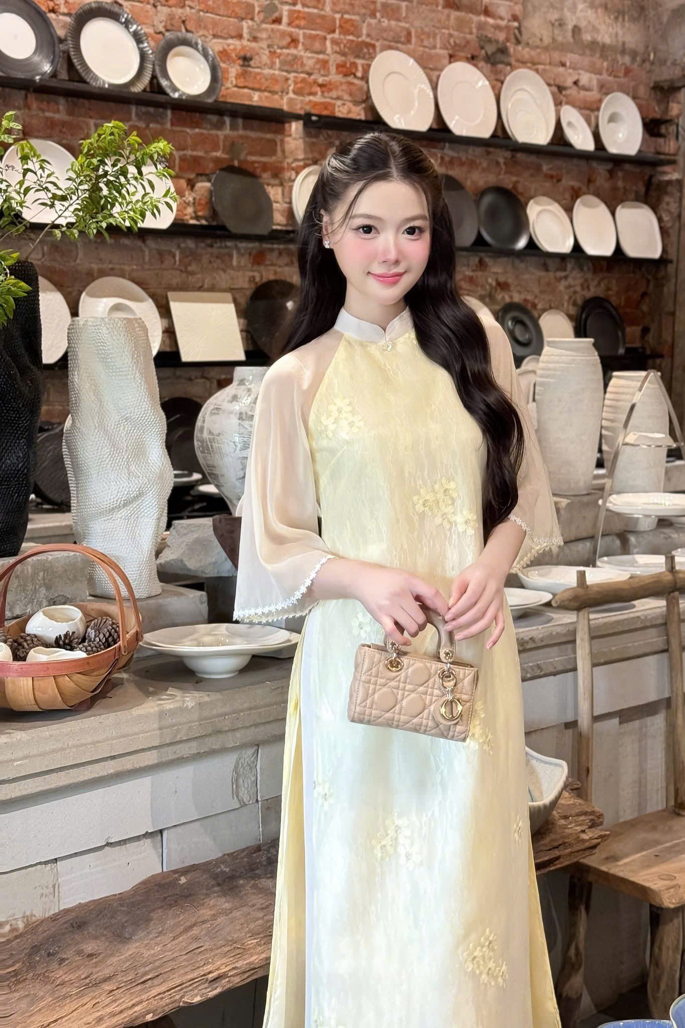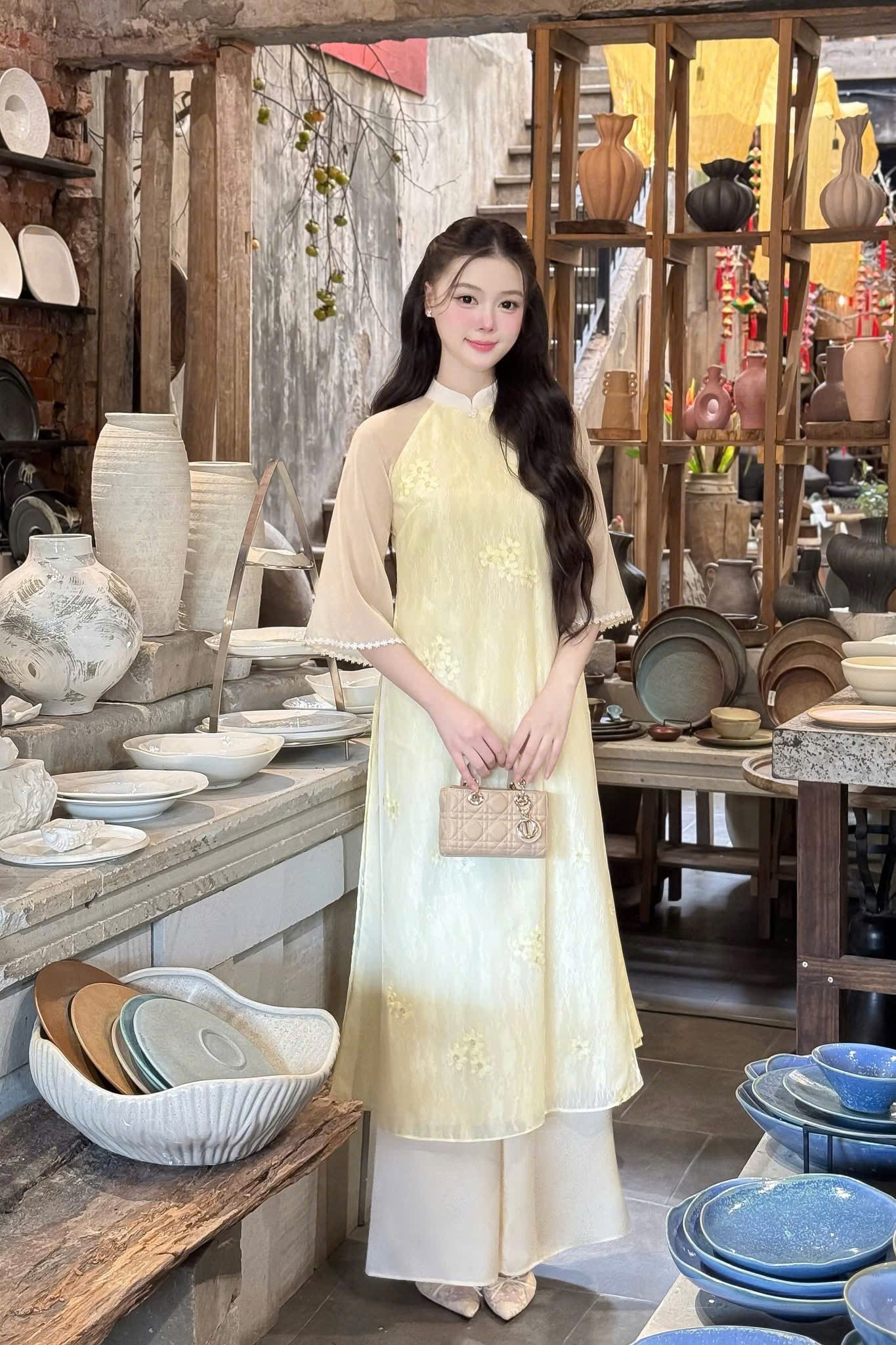 Áo Dài Hai Lớp Hoa Nổi Vàng là một mẫu áo dài truyền thống với họa tiết hoa nổi màu vàng đặc biệt nổi bật. Chất liệu là lụa tơ tằm nguyên chất kết hợp với gấm hoa thêu màu vàng đồng. Mẫu áo dài này không chỉ tôn lên vẻ đẹp truyền thống, mà còn mang đến sự tươi mới và hiện đại.
