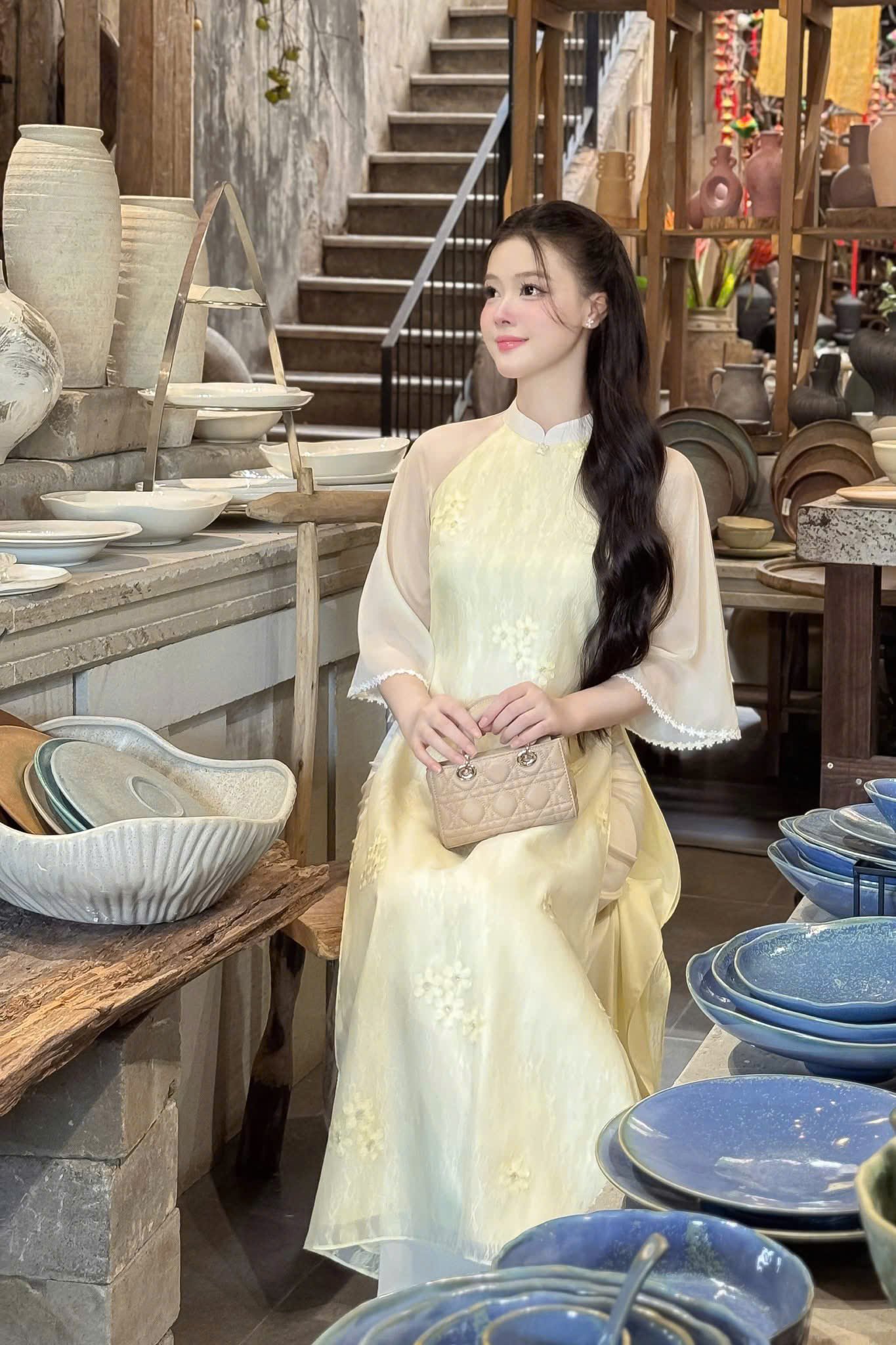 Cho Thuê Áo Dài Tơ Thêu Mỹ Hoa Vàng Kem