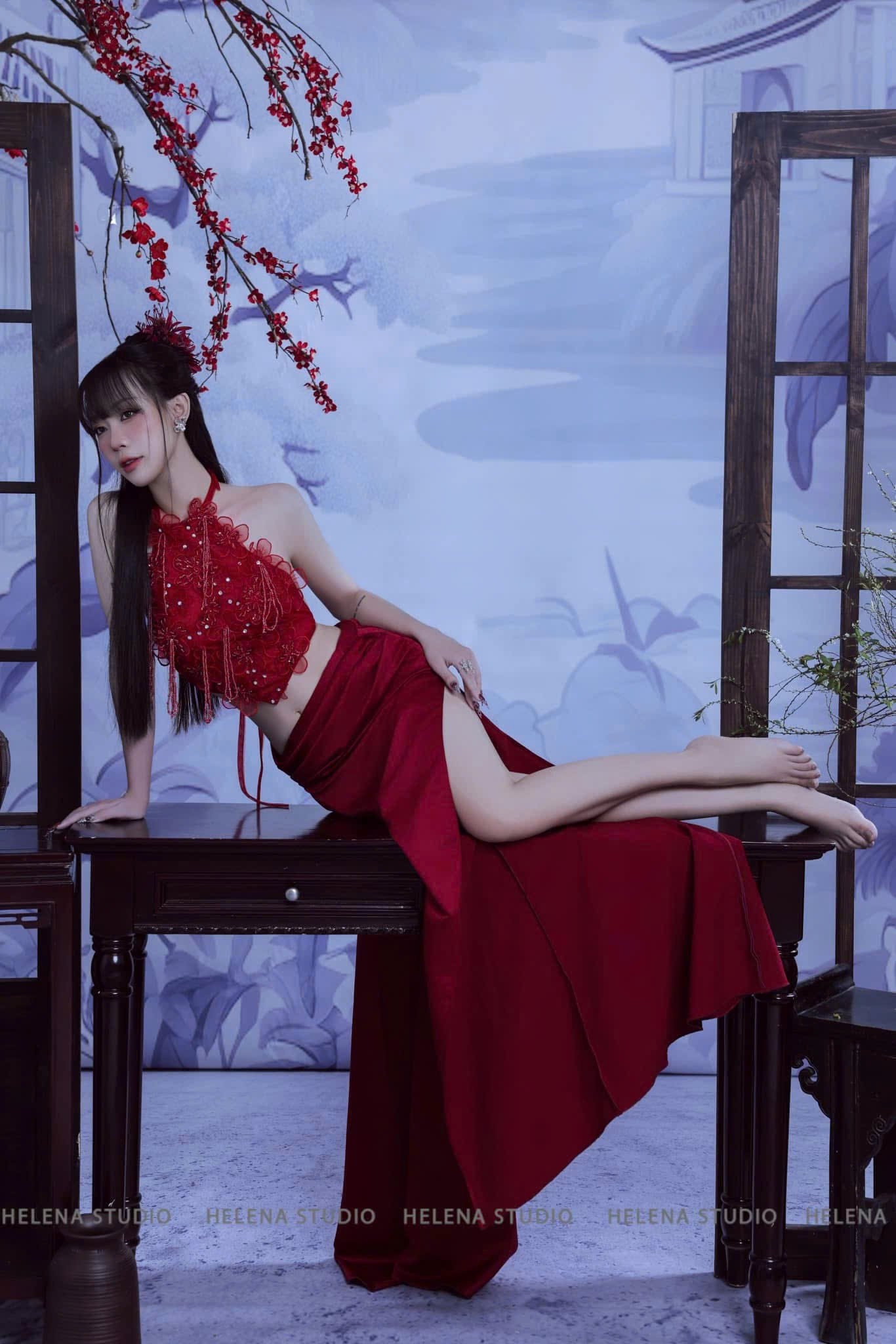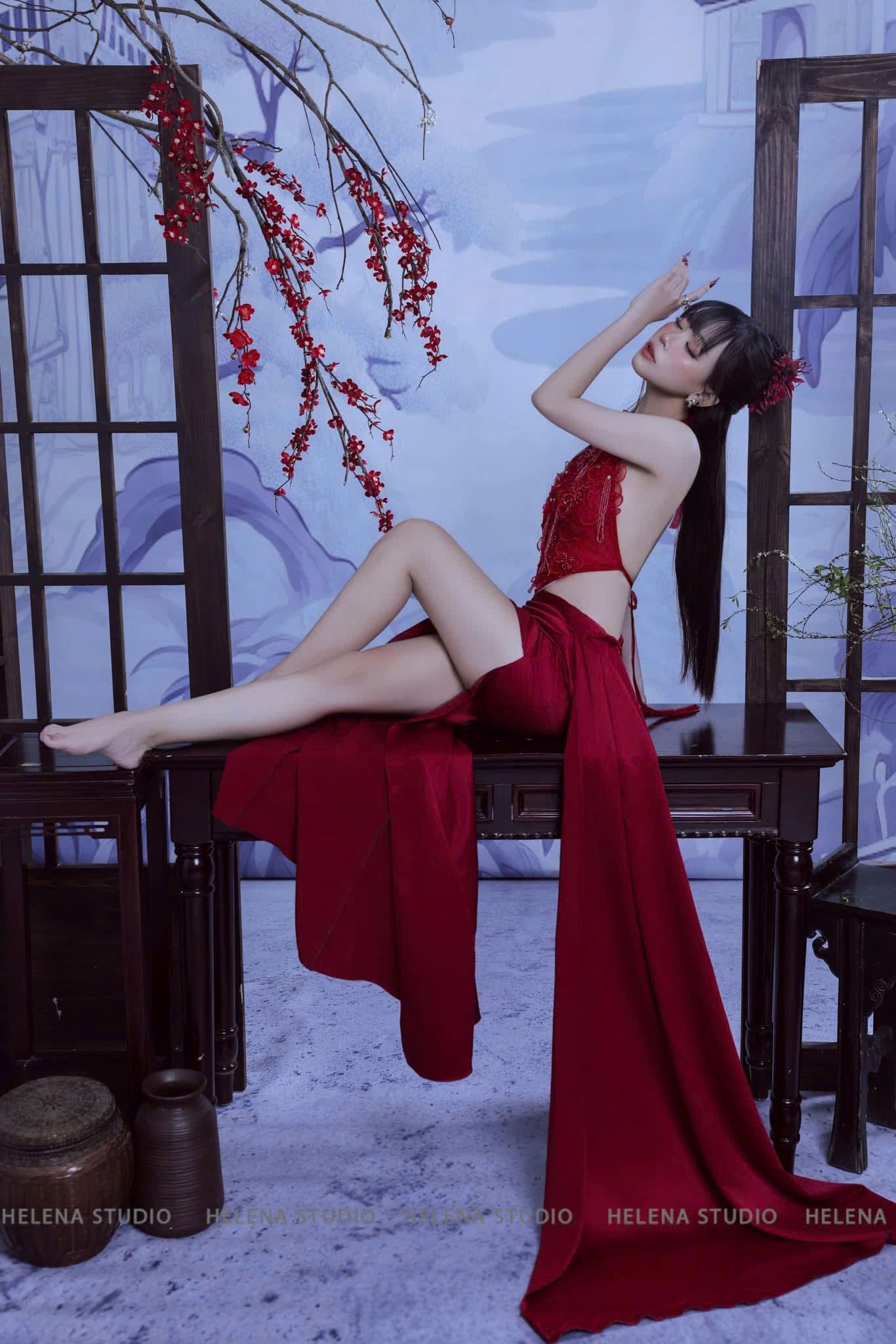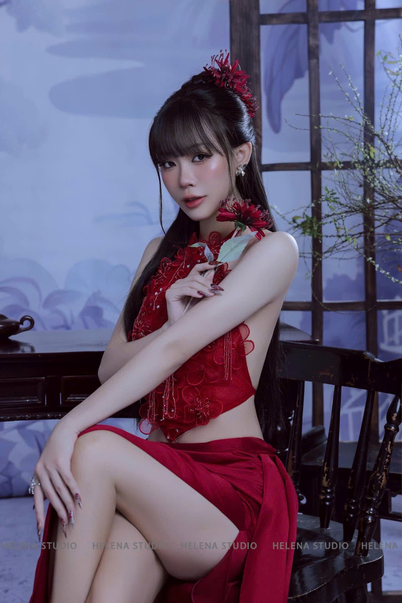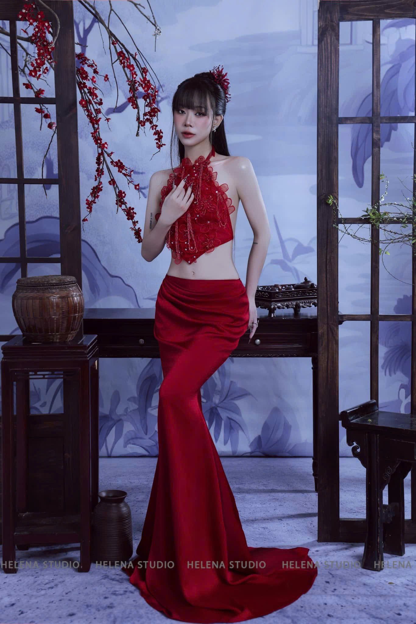 Set Yếm Ren Kết Hoa Đỏ nổi bật với thiết kế yếm truyền thống kết hợp chất liệu ren mềm mại, tạo nên vẻ đẹp quyến rũ và thanh lịch. Hoa đỏ được kết thủ công tinh xảo, mang lại điểm nhấn nổi bật và đầy nghệ thuật. Phần chân váy xẻ cao giúp tôn dáng và tăng thêm nét gợi cảm hiện đại. Đây là lựa chọn hoàn hảo cho những dịp chụp ảnh nghệ thuật hoặc sự kiện đặc biệt.