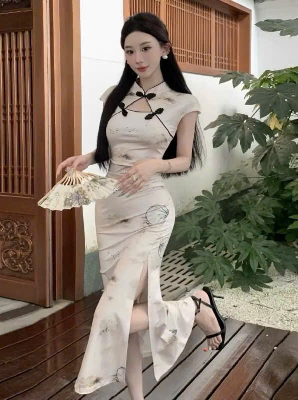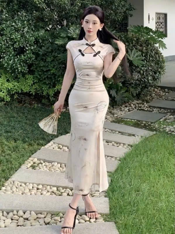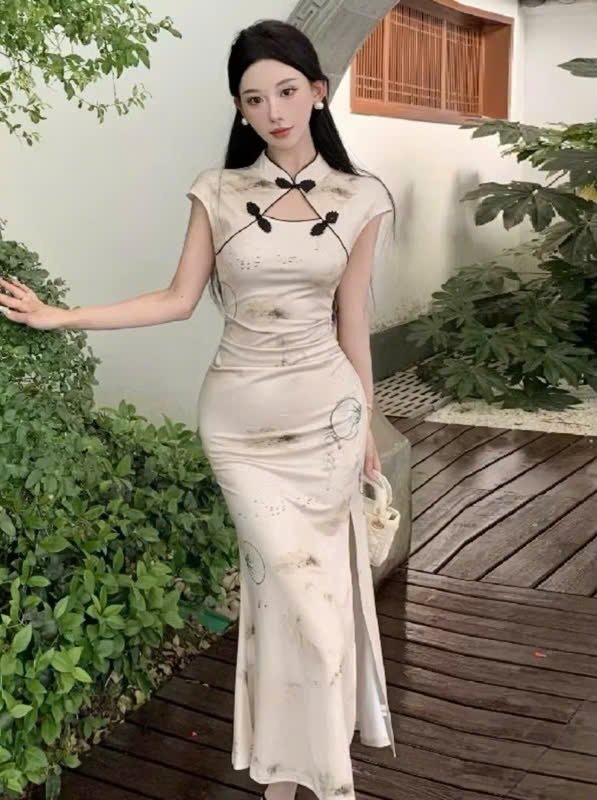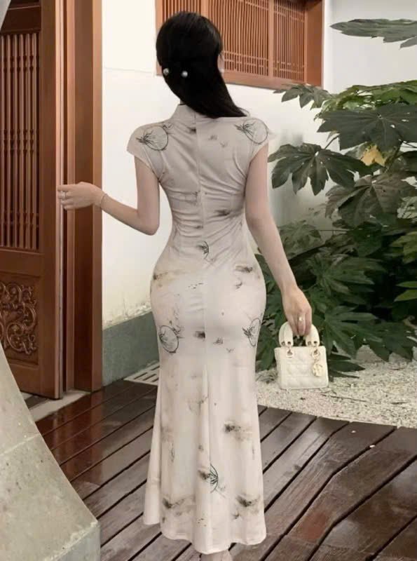 Cho Thuê Sườn Xám Thuỷ Mặc Xanh 3 Nút Tàu Kem