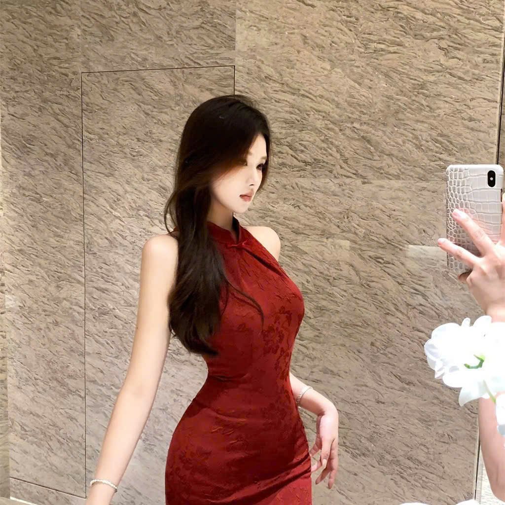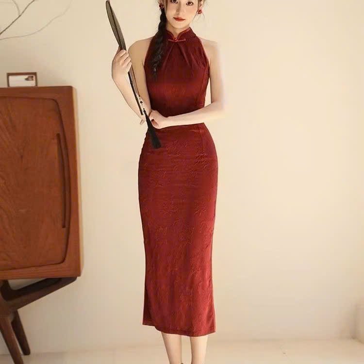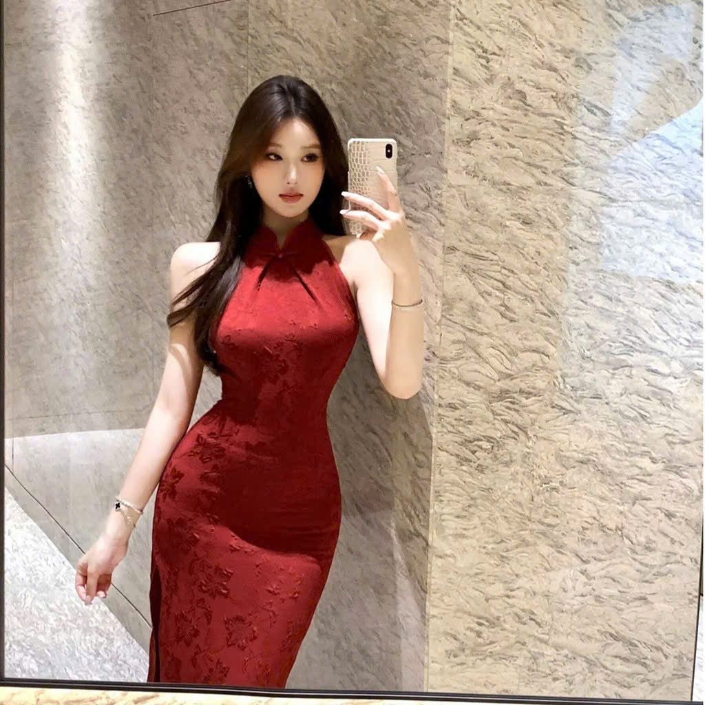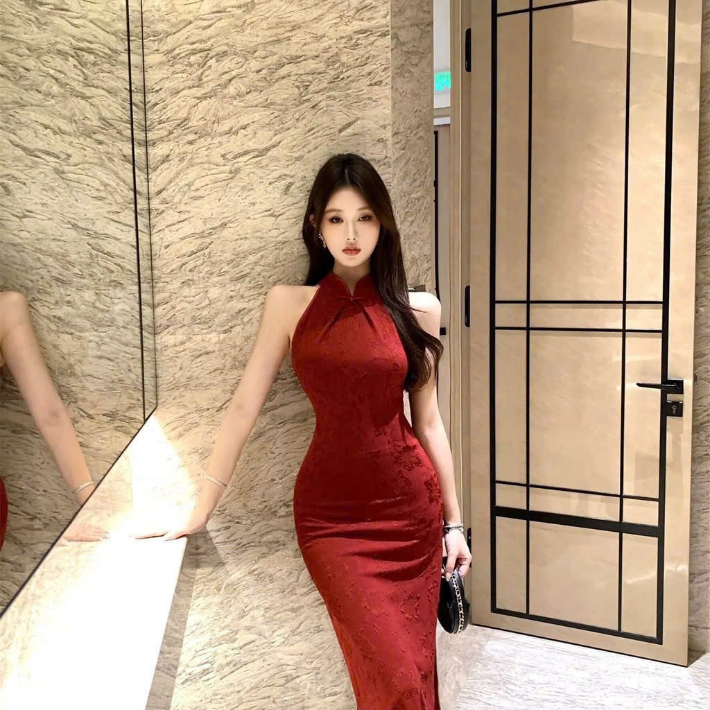 Cho Thuê Áo Dài Cổ Tròn Hoa Chìm Đỏ (Có Bigsize)