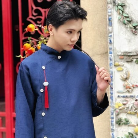 Áo Dài Nam Xanh Dương Nút Sao mang phong cách lịch lãm, nam tính với gam xanh dương trang nhã và chi tiết nút sao tinh tế. Thiết kế áo dài nam cổ đứng, phom suông vừa phải giúp người mặc trông chững chạc và chỉnh chu.